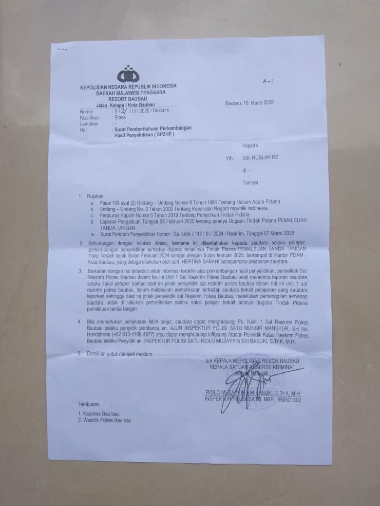 Laporan Dugaan Pemalsuan Tandatangan Mantan Direktur PDAM Baubau, Polisi Terbitkan SP2HP